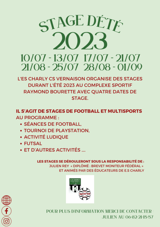 L'ES Charly CS Vernaison organise des stages durant l'été 2023 au complexe sportif Raymond Bourette avec quatre dates de stage.