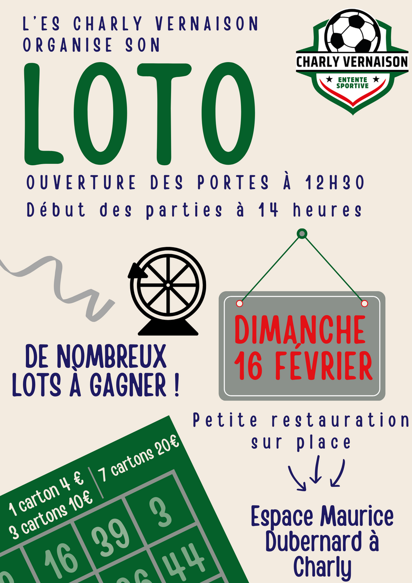 Ne manquez pas notre grand LOTO, le dimanche 16 février à l'Espace Maurice Dubernard à Charly !